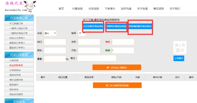 手工新建订单里面包含4种下单方式:手工点击输入框填写商品信息、从历史购买记录添加、货源网商品链接识别采集下单、、商家编码解析下单查看视频教程
