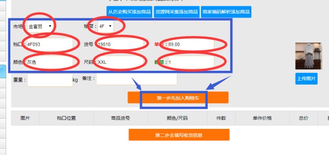 手工下单里面管采用哪种下单方法,第一步都是填写或者自动识别采集到商品信息,市场、楼层、档口、货号、颜色、尺码、金额、数量,这8项全部需要填写完整,然后点下面的“第一步先加入购物车”