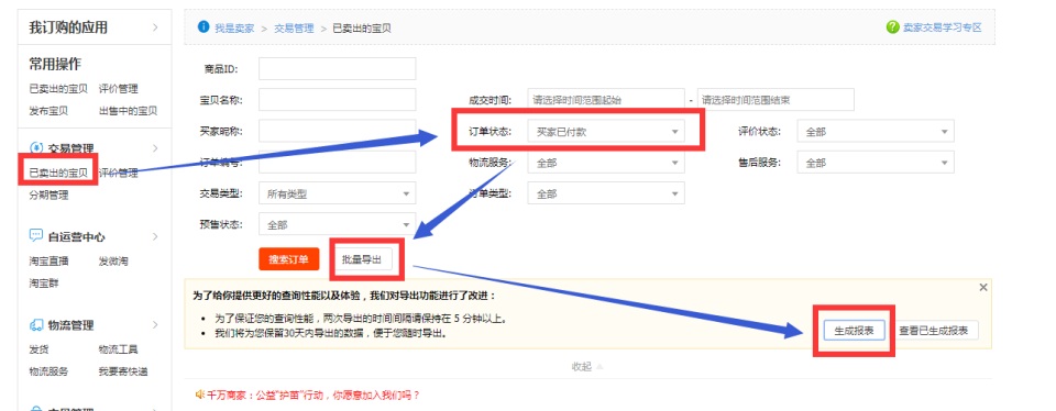 【第一步下载淘宝后台的宝贝报表和订单报表】首先进入淘宝卖家中心后台---在交易管理里面找到 已卖出的宝贝---订单状态选择买家已付款---批量导出---生成报表---下载订单报表---下载宝贝报表【下图示】