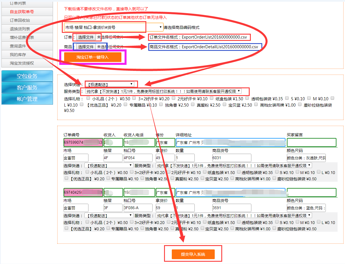 然后---选择快递,纯代拿请选择“【极速配送】”(买家没有特别要求尽量选择排序第一的快递,深度合作有问题可以及时处理)---选择服务类型---选择需要的小礼物---提交导入系统就可以了,完成之后点击订单列表选择需要付款的订单进行付款、发货等操作