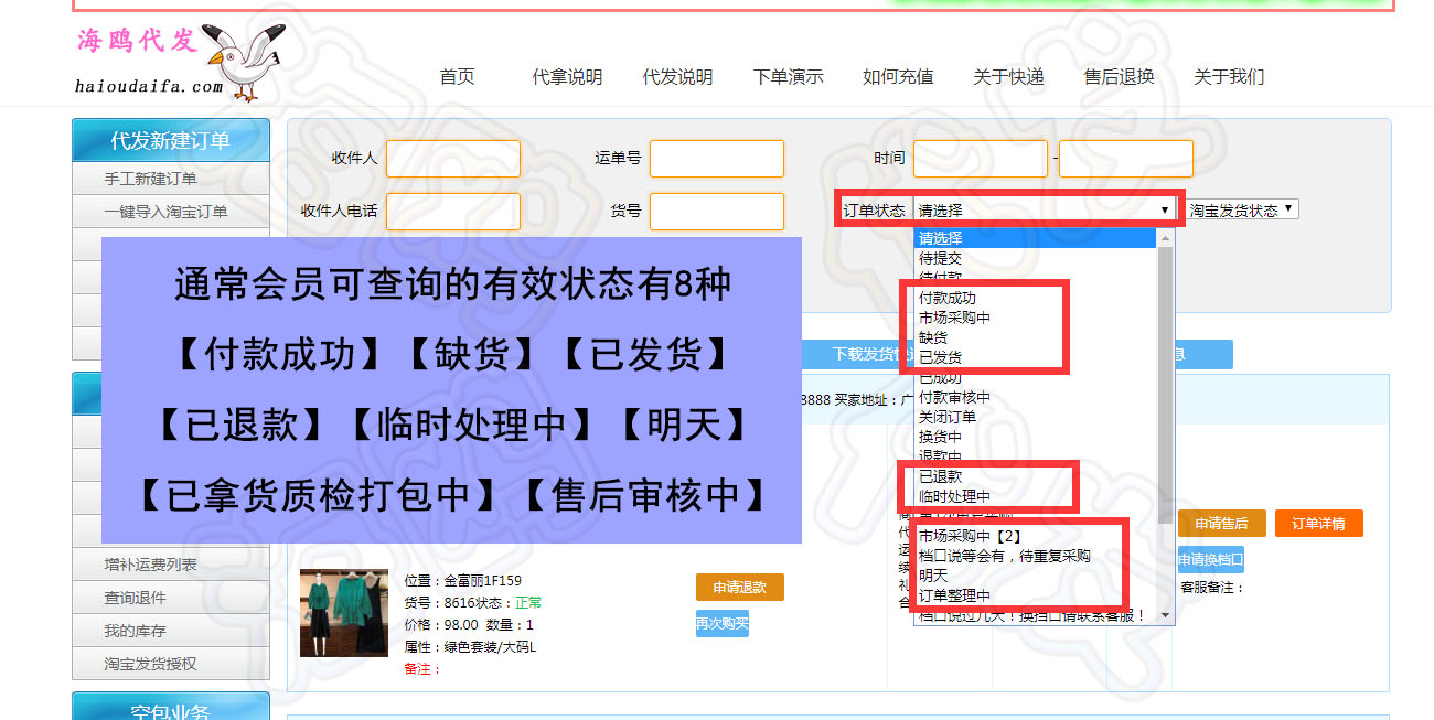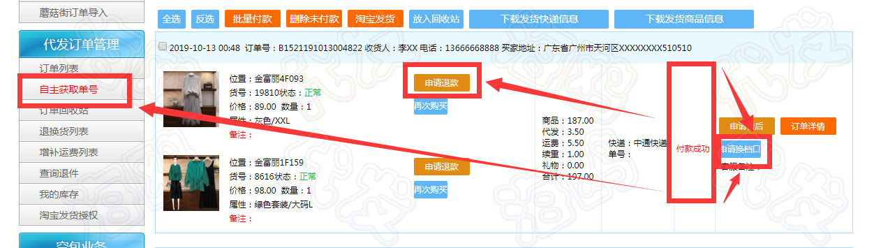 “付款成功”和“缺货”订单状态的特别说明 此状态下会员可进行的操作包括:获取快递单号、申请退款、申请换挡口等入口权限