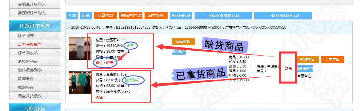 缺货状态的缺货说明:多件订单的缺货中没有拿到货的商品当天都会做出备注说明缺货原因,商品状态默认显示正常;已拿到货的商品会进行验货处理,商品状态显示验货完成 没有特殊情况备注空白(示图)