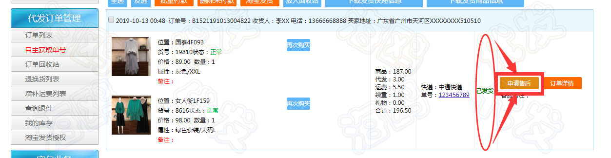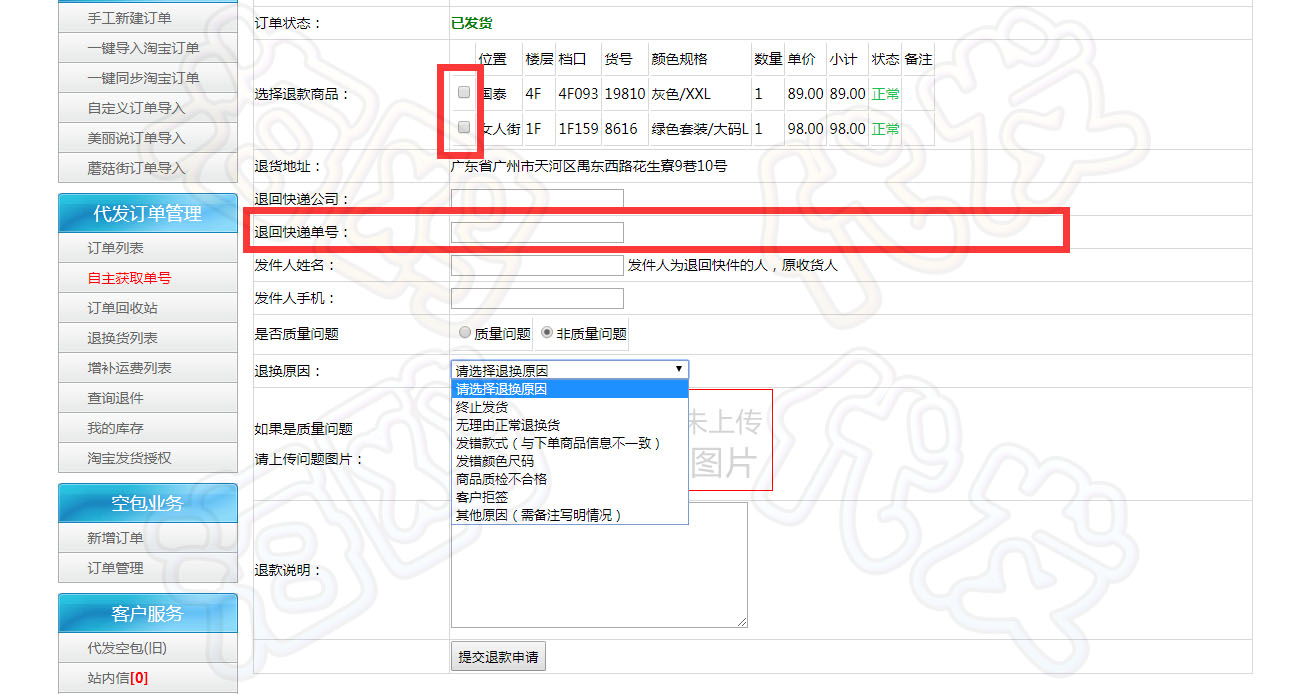已发货订单的退货售后申请只有订单状态在“已发货”、“已成功”等状态才能有效提交退货信息(示图)