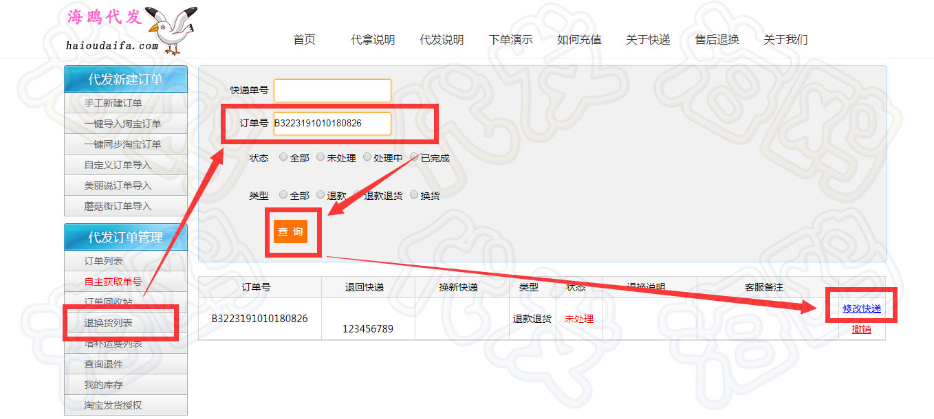 1:退货快递单号填写错误有一种单号错误只是错了其中一个数字这种一般查不到任何物流信息;还有一种单号错误是真实单号,可以查询到物流信息,但是最终签收地不是我这里的,这种一般是买家退货时可能同时寄出去2个以上快递填写退货单号混淆造成的,比如同时给海鸥代发这里寄了A快递单号是123,又同时给浙江一个卖家寄了B快递单号是456,结果填写退货信息是把我这里的退货单号填写了456,给另一家退货单号填写了123,这种需要及时联系买家找到正确的快递单号,及时认领退件!【退货信息最重要的是单号不要填写错误,单号错误我这边就无法帮你及时处理,请及时修改退回快递单号】【会员中心--退换货列表--输入需要修改退货快递的订单号--查询--修改正确的快递。如果正确的快递已经被签收请及时认领退件】