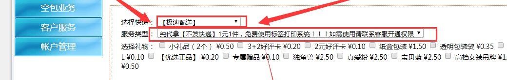 纯代拿模式快递一栏选择“【极速配送】”服务类型一栏选择“纯代拿【不发快递】1元1件,免费使用标签打印系统!!!如需使用请联系客服开通权限”(示图)