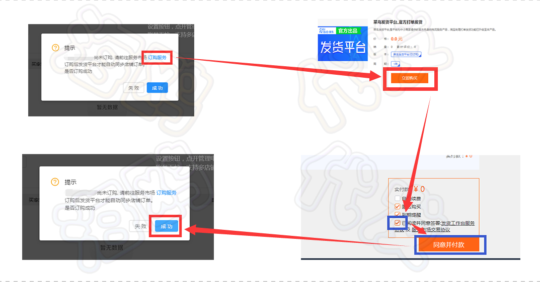 扫描小标签打单发货的方法【菜鸟官方免费】:首先用卖家账号登陆菜鸟打单发货页面-->>【网址:https://fahuo.cainiao.com】首次登陆会有订购提示【菜鸟官方0元1年】,点击“订购服务”--“立即购买”--“勾选协议”--“同意并付款”--点击“成功”即可免费使用菜鸟打单发货服务(示图1)