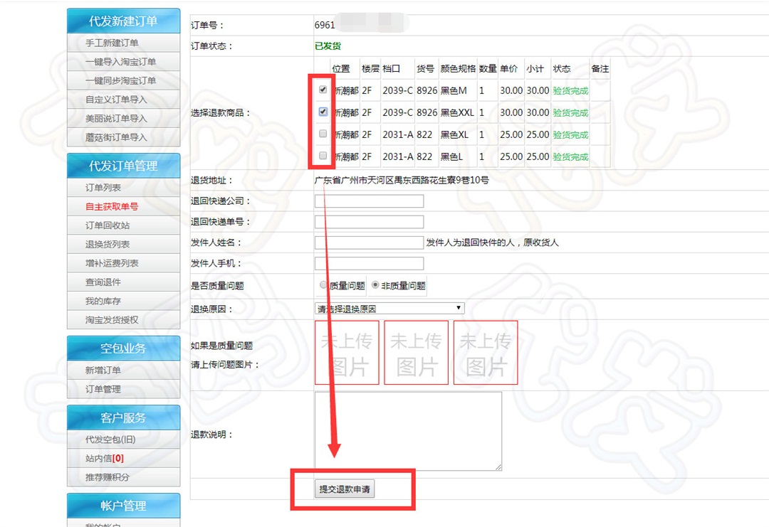 3. 选择【退货退款】--勾选需要退货的商品(示图)---纯代拿模式售后退回快递单号、快递公司等信息可以全部留空白,但是退回包裹内每件商品尽量保证当初采购小标签的完整性,如采购标签已经遗失的务必使用小纸条写上买家收货手机号!