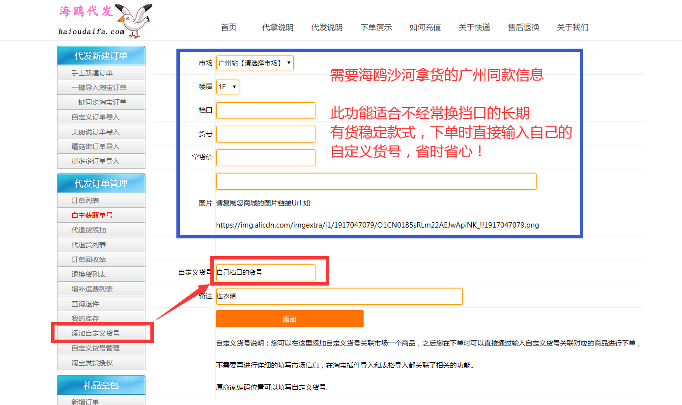 有些杭州老板的同款货源在沙河这边比较稳定的话可以自定义货号(看下图),自定义货号之后下次下单可以直接输入自己填写的货号来下单了,比较省事。如果使用图搜或者搜索找到同款的话可以用货源网址采集的方式进行下单,也是比较的方便的。(视频中的地址识别是老版的,现在已经做了升级没有那么严格的格式,大部分平台直接复制过来即可识别)