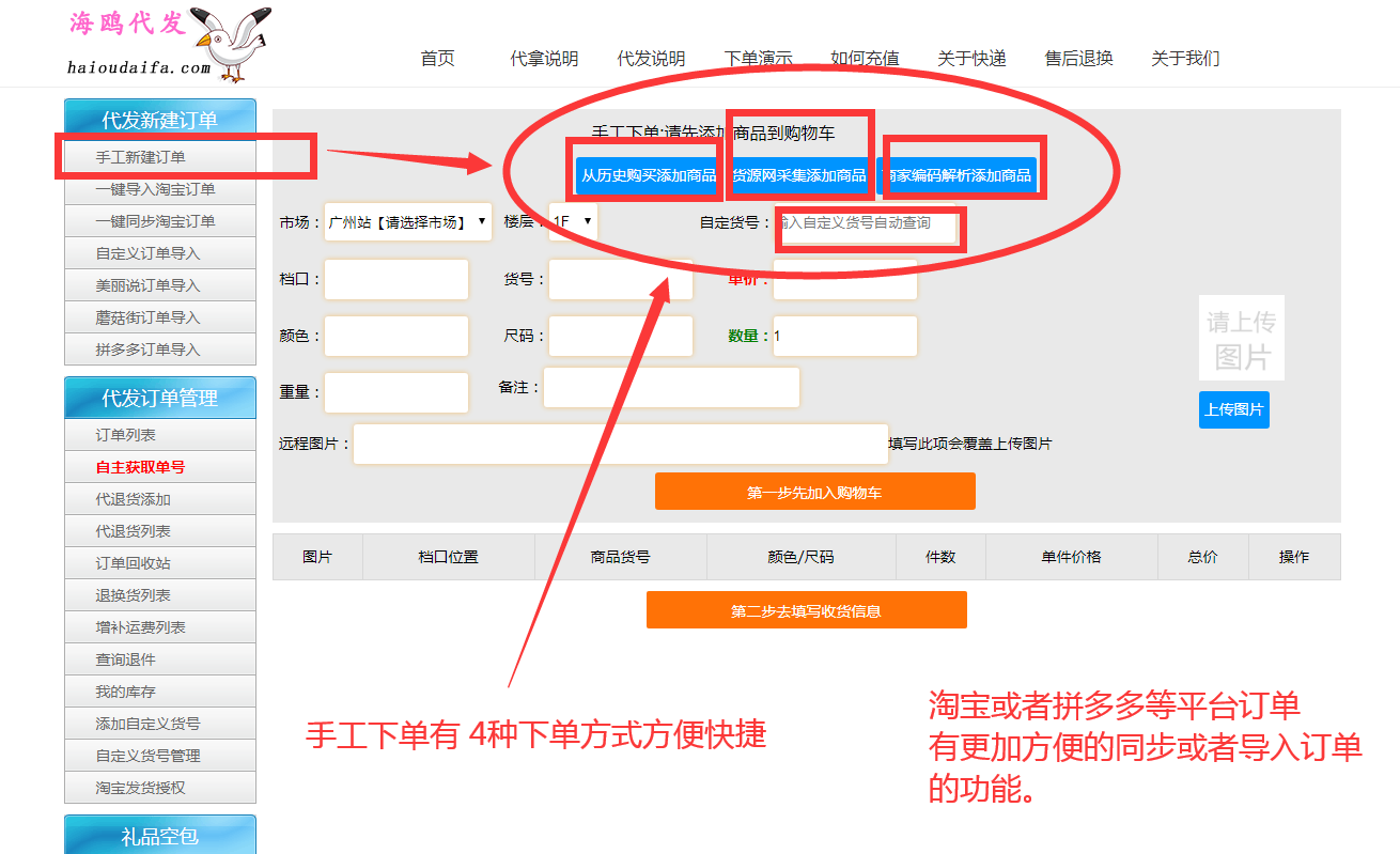 手工下单有4种下单方式可供选择,(看下图)查看视频教程、查看图片教程