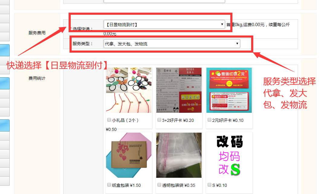 添加完商品后,下面说一下物流和服务类型的选择:杭州档口老板需要调货的选择【日昱物流到付】,服务类型选择【代拿、发大包、发物流】如下图所示