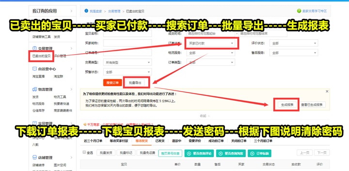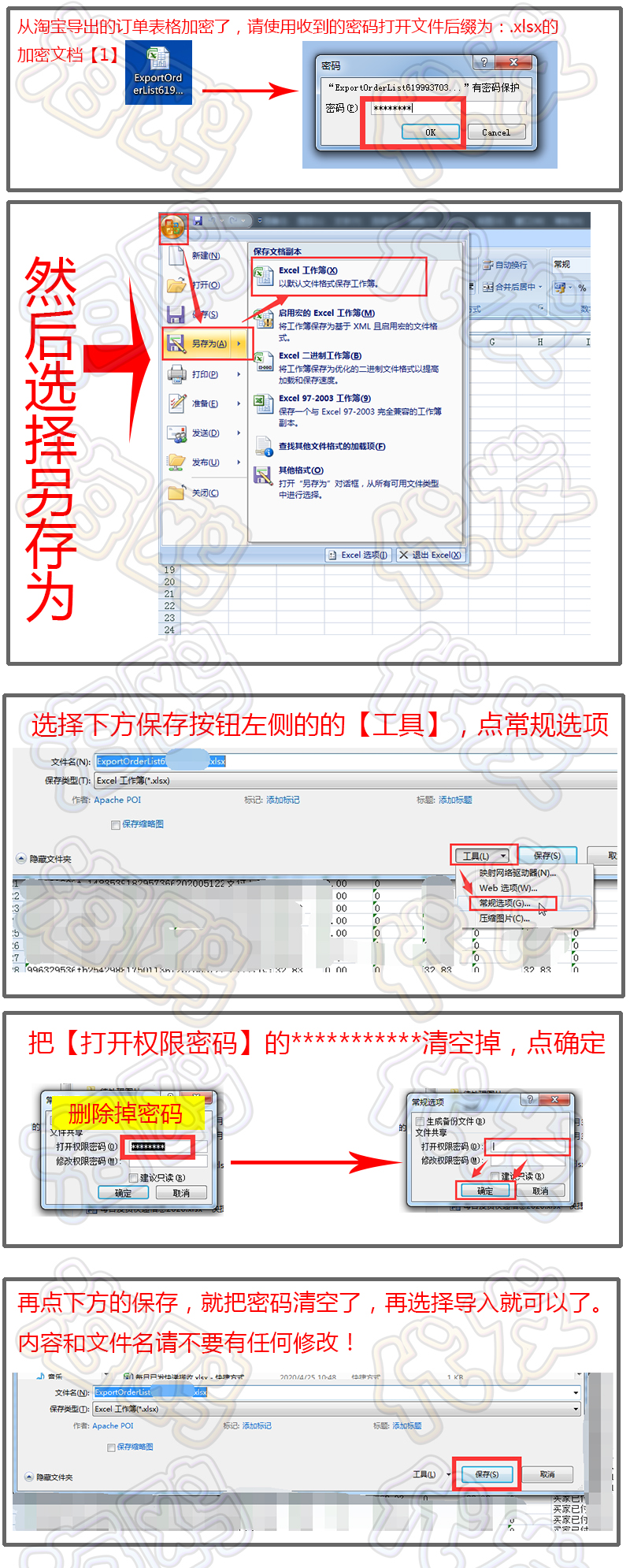 特别注意!导出来的订单,除了清除密码以外,请不要做任何修改,包括文件名也不要修改!不然会出错,要修改也等到导入之后 提交之前修改。