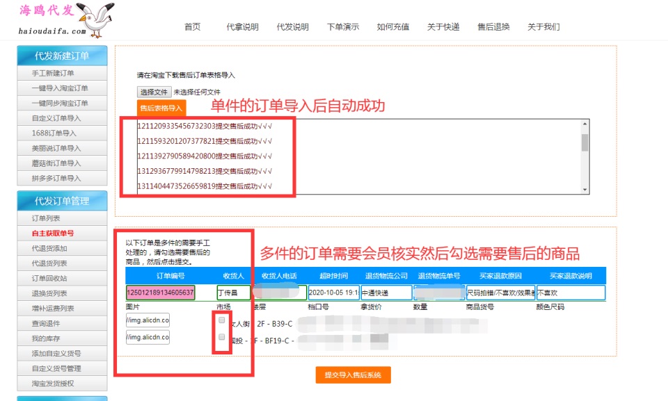 售后批量申请是根据订单号匹配的,代发订单号和淘宝订单号一致就可以使用一键同步发货和这次的批量导入售后功能。