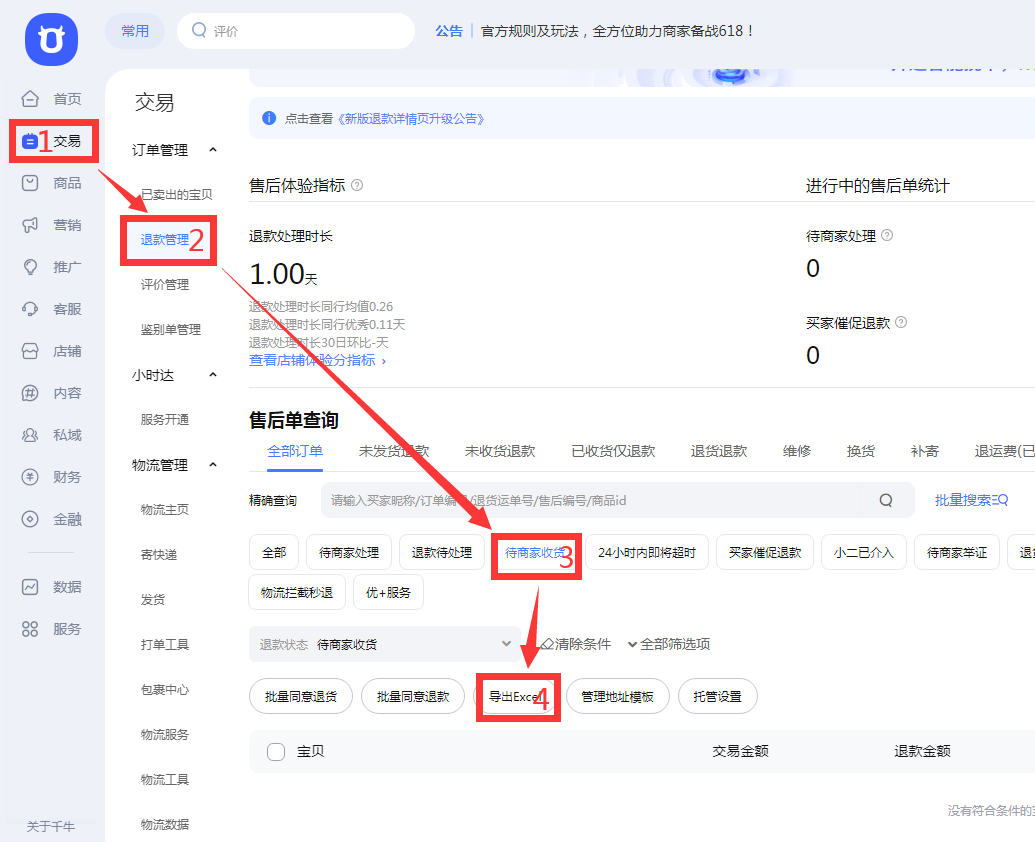 第一步:需要导出淘宝售后买家已寄出的订单,导出之前建议大家先查询每天代发已退款订单-->>。将查到的已退款订单,给买家处理退款后再导出,这样就会减少大部分重复导出。图一是查看代发后台每天退款的订单。图二是导出淘宝的售后订单参考下面图示:千牛卖家中心/交易/退款管理/待商家收货/导出Excel