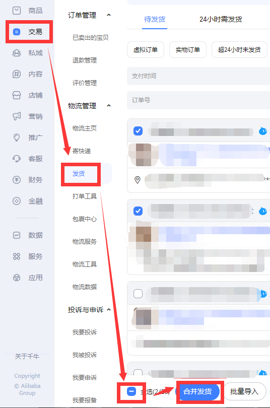 3:点合并发货后的页面,如下图所示,记得解密订单